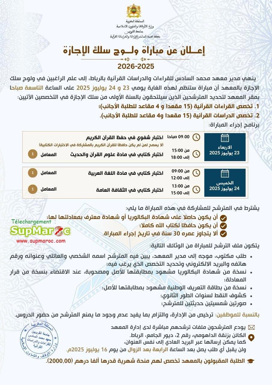 ينهي مدير معهد محمد السادس للقراءات والدراسات القرآنية بالرباط، إلى علم الراغبين في ولوج سلك الإجازة بالمعهد أن مباراة ستنظم لهذه الغاية يومي 23 و 24 يوليوز 2025 على الساعة 09 صباحا بمقر المعهد لتحديد المترشحين الذين سيلتحقون بالسنة الأولى من سلك الإجازة في التخصصين الآتيين: