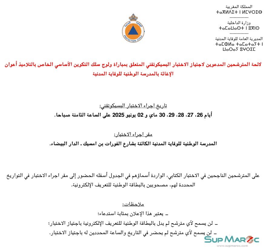 لوائح المدعووين للاختبار البسيكوتقني مباراة توظيف التلاميذ أعوان الإغاثة (693 منصبا) الوقاية المدنية 2025