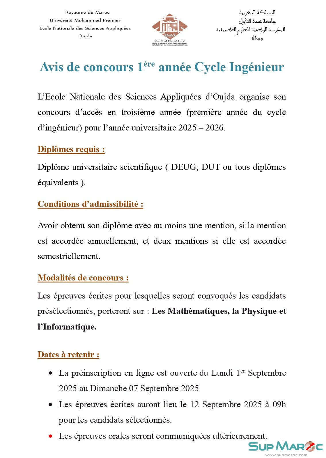 ENSA Oujda Concours d’accès en première année du cycle ingénieur 2025 / 2026