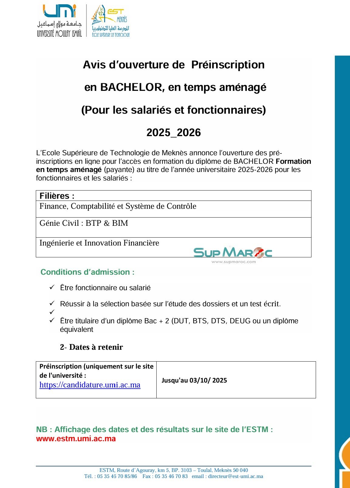L’Ecole Supérieure de Technologie de Meknès annonce l’ouverture des pré inscriptions en ligne pour l’accès en formation du diplôme de BACHELOR Formation en temps aménagé (payante) au titre de l’année universitaire 2025-2026 pour les fonctionnaires et les salariés