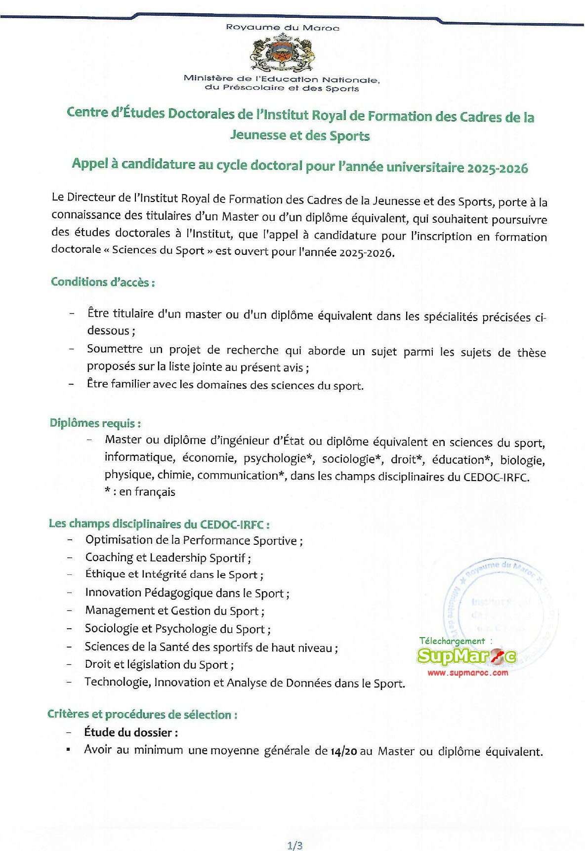 سلك الدكتوراه المعهد الملكي لتكوين أطر الشبيبة والرياضة 2025