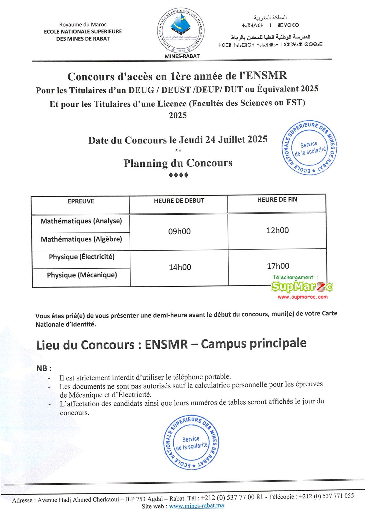 Planning Concours ENSMR 1ère année Mines Rabat 2025