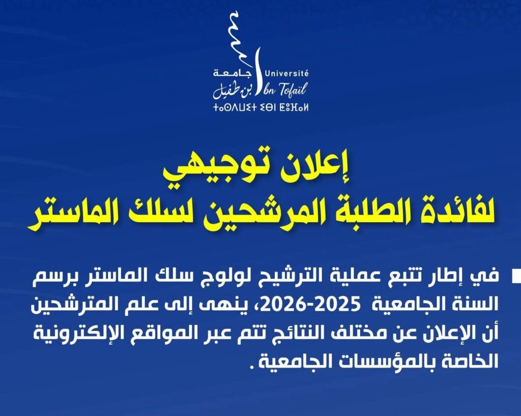 Dans le cadre du suivi du processus de candidature pour l’accès au cycle Master au titre de l’année universitaire 2025-2026, il est porté à la connaissance des candidats que la publication des différents résultats s’effectue via les sites web des établissements universitaires concernés.