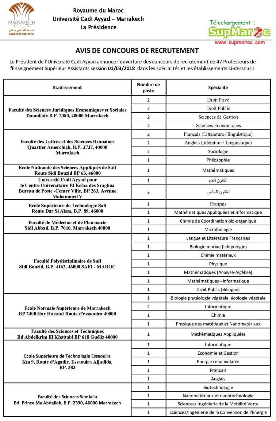 AVIS DE CONCOURS DE RECRUTEMENT Le Président de l’Université Cadi Ayyad annonce l’ouverture des concours de recrutement de 47 Professeurs de l’Enseignement Supérieur Assistants session 01/03/2018 dans les spécialités et les établissements ci-dessous :
